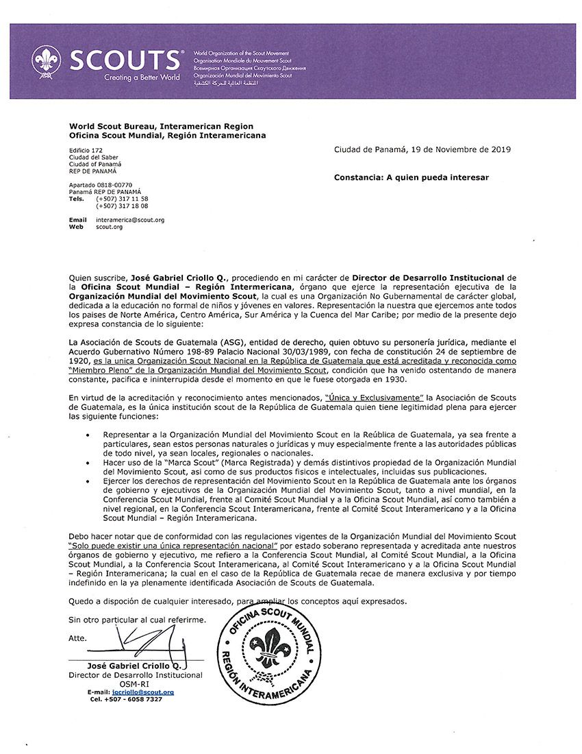 La Asociación de Scouts de Guatemala pertenecemos a la Organización Mundial del Movimiento Scout. (OMMS o WOSM por su acrónimo en inglés)